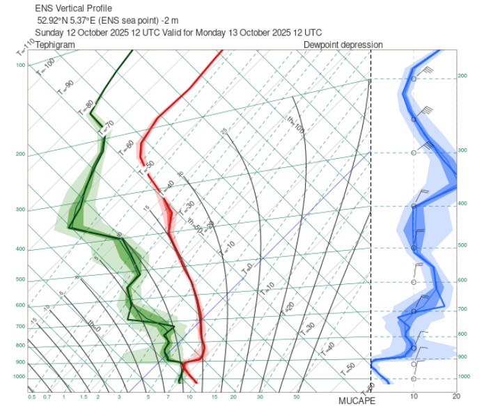 De GWL die vandaag, 13 oktober 2025, bepalend is heet NWA (of NWa): een anticyclonale NW-circulatie. Rondom een groot hogedrukgebied boven Engeland (zowel in de bovenlucht als aan de grond, zie Fig. 1) stroomt maritiem polaire lucht met een grote boog vanaf de Atlantische Oceaan naar het zeegebied ten noorden van Schotland (Fig. 2) en vandaar naar het zuiden over de Noordzee naar ons land. Onderweg pikt de lucht veel vocht op, en dat vocht kan niet ontsnappen doordat dalende bewegingen nabij het hoog zorgen voor een subsidentie-inversie. Dit alles zien we duidelijk terug in Fig. 3 en 4. Een NWA is bepaald niet zeldzaam, zoals we zien op de site van fotomedia.ch. Op diezelfde site zien we ook een voorbeeld van de Grosswetterlage HB, Hoch Britische Inseln. De huidige weerkaart zou je dus ook kunnen toewijzen aan een HB, al komt HB in oktober niet vaak voor.
