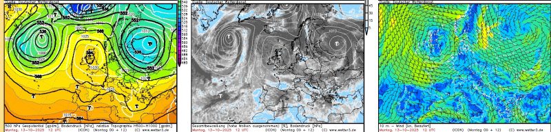 Fig.1 Links: Hoogte 500hPa, dikte 1000-500 hPa (maat voor gemiddelde temperatuur), gronddruk.