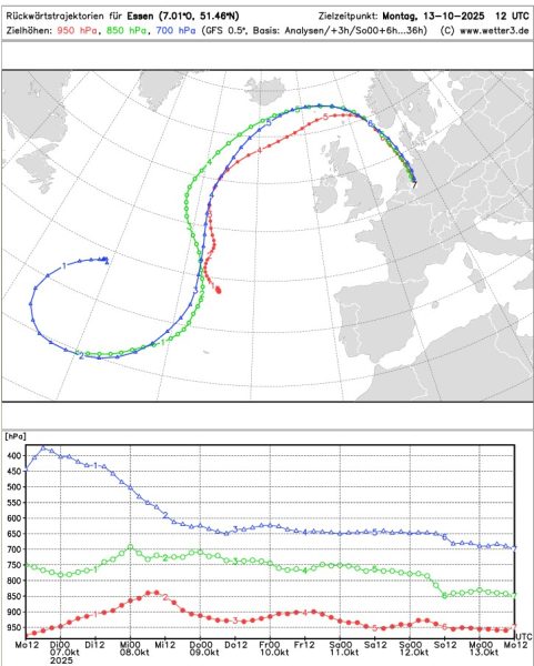 Fig. 2 Trajectorieën (950, 850, 700 hPa) die eindigen in Essen.