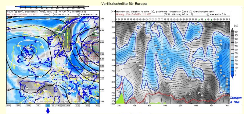 Rechts: verticale doorsnede, Z-N langs de 5-graden meridiaan met een dikke vochtige laag ten noorden van 50NB.