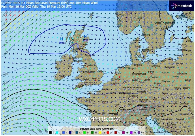 Combineren we al die “voorwaarden” dan is de periode medio maart – medio mei het meest gunstig. Ook al omdat een hogedrukblokkade met langdurig droog en zonnig weer in deze periode vaak voorkomt. Onderstaande weerkaart voor donderdag 19 maart toont zo’n hogedrukgebied – de kern ligt boven Schotland maar een eerder gevormde uitloper zien we nog boven Noord-Duitsland en Polen.
