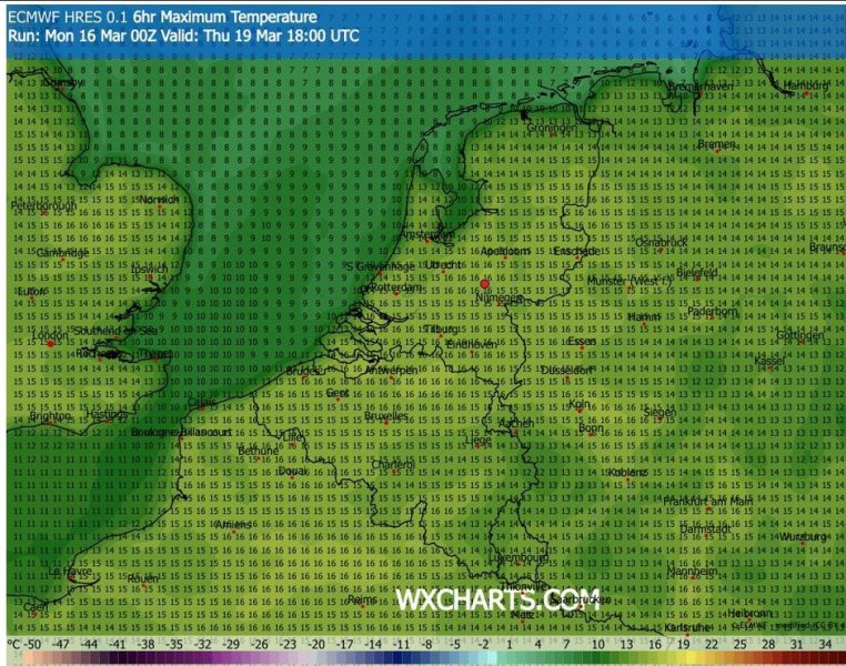 In onderstaande “pluimverwachting”, gebaseerd op de ECMWF run van 16 maart 0 UTC, valt de grote temperatuurschommeling direct op: op donderdag 19 maart is het in het oosten van het land om 6 UTC rond 0 graden en tussen 12-18 UTC rond 15 graden – het maximum omstreeks 15UTC zal nog iets hoger zijn.
