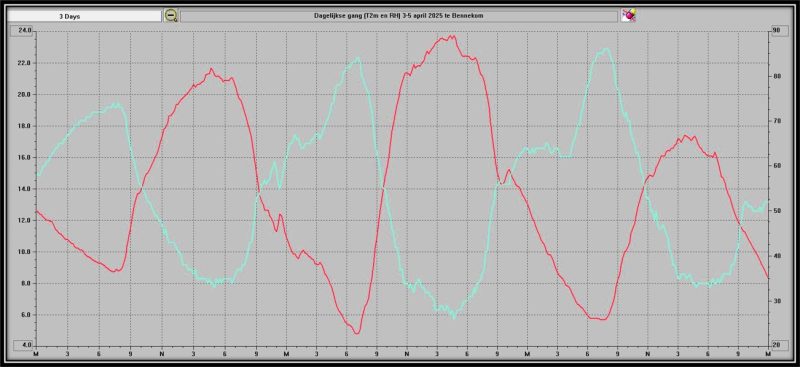 In het droge voorjaar van 2025 zagen we wel dagen met een enorme dagelijkse gang. Op mijn weerstation in Bennekom-Zuidoost registreerde ik op 4 april een verschil van bijna 19 graden. Tussen 7 en 12u (zomertijd) stijgt de temperatuur maar liefst 17 graden! Let ook op de droge lucht, de relatieve vochtigheid is lager dan 30% in de middag, het was dan ook al 5 weken vrijwel helemaal droog; in de nacht blijft de RH <90% en er is geen/weinig dauwvorming. De grote natuurbrand tussen Ede en Otterlo vond niet voor niets de dag ervoor, op 3 april, plaats.
