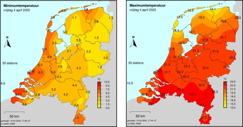 Minimum en maximum op KNMI stations op 4 april 2025