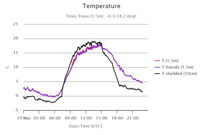 Bij mij in Bennekom was de dagamplitude bijna 18 graden (van +0,5 naar +18,3). Op het meetveld van Wageningen Universiteit was de dagamplitude zelfs ruim 18 graden.