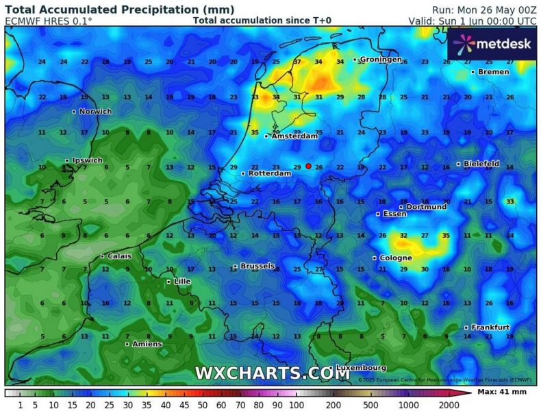 Er is de afgelopen dagen gemiddeld al 10mm regen gevallen, maar de westcirculatie komt nu op snelheid en de komende 4 dagen wordt aanzienlijk meer neerslag verwacht. Niet alleen in DeBilt maar ook landelijk gaat de lente van 2025 hierdoor toch niet meer de boeken in als droogste ooit gemeten (zie vorige Blogpost).