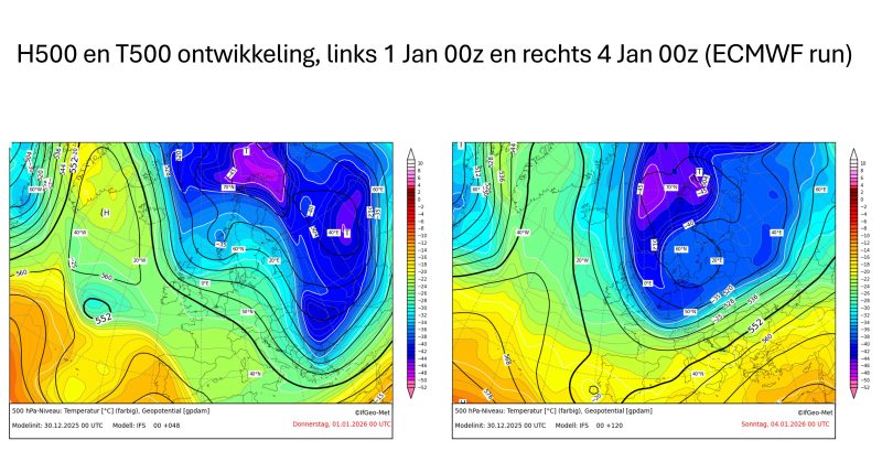 In de hoofdrun van het ECMWF van 30 december zien we toevallig twee van die kleine poollaagjes op de Noordzee op dinsdag 6 januari. Waait de wind voorafgaand aan zo’n laagje uit het westen, dan vriest het ook in de nachten haast niet; volgt er een heldere stille nacht boven een vers sneeuwdek dan wordt het zomaar -10. Ook hiervoor geldt: afwachten maar!