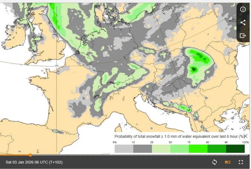 ECMWF Open Charts, kans op >1mm waterequivalent aan sneeuw voor 3 jan 2026 00-06z