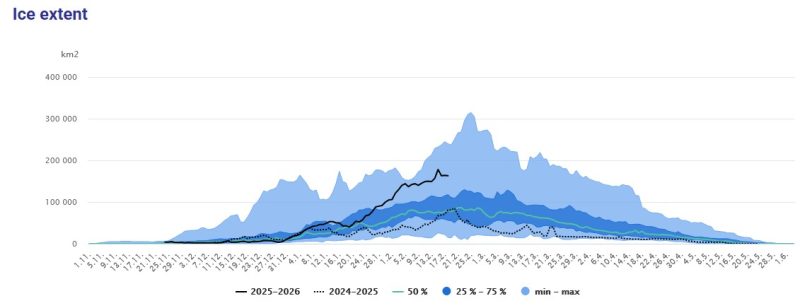 Vergelijken we de totale ijsbedekking met die van de afgelopen jaren, dan is het verschil groot. Het seizoen begon, na een zachte december, nog met relatief weinig ijs. In januari werd het kouder, en vooral in de afgelopen 4 weken is de ijsbedekking flink toegenomen. Er ligt bijna 2x zo veel ijs als vorig jaar (https://en.ilmatieteenlaitos.fi/ice-conditions). Meestal neemt de ijsbedekking tot begin maart nog iets toe, maar het koudste weer lijkt nu toch voorbij (zie hierna).
