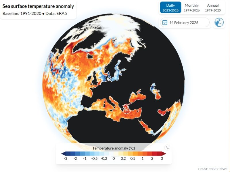 Het langdurig koude weer zien we ook terug in de afwijking van de zeewatertemperatuur. Grote delen van de Atlantische Oceaan en de Noordelijke IJszee zijn relatief warm, en ook de Middellandse Zee is warm. Maar de oostelijke Noordzee, de Oostzee en de Botnische Golf zijn duidelijk te koud.