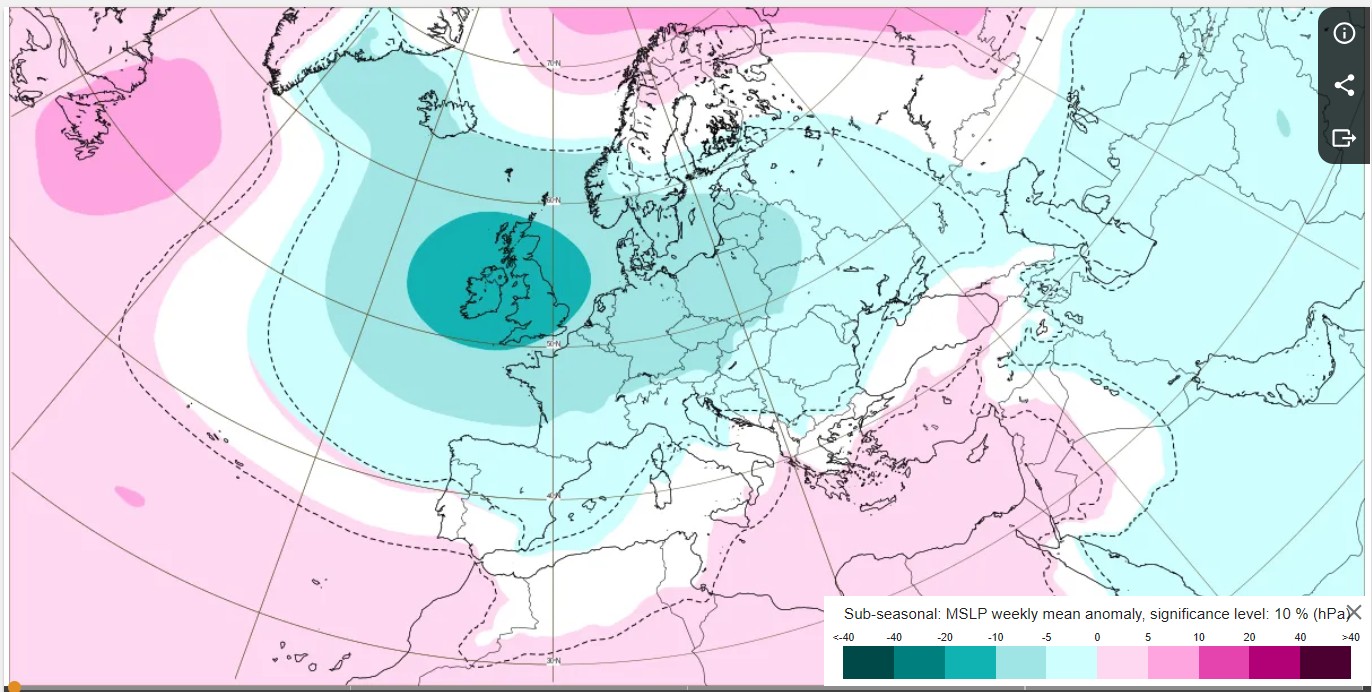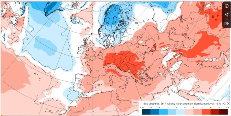 Hieronder zien we de verwachte gemiddelde afwijking voor de luchtdruk (links) en die voor de temperatuur (rechts) voor volgende week, dat is voor de periode van 23 februari – 1 maart (ECMWF Open Charts). Boven de Britse Eilanden is de luchtdruk volgende week veel lager dan gemiddeld, dat betekent voor Europa een sterke voorkeur voor een ZW-stroming. Behalve zeer zacht is het daarom in west en centraal Europa ook (erg) nat. In centraal Europa kunnen al enkele lentedagen (middagtemperatuur 15 graden of hoger) voorkomen! De ergste kou is ook in Oekraïne voorbij.