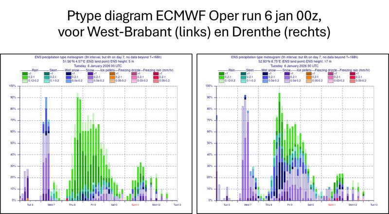 Het is duidelijk dat er met de Atlantische storm veel zachtere lucht wordt aangevoerd. De kans op regen is dus groot, vooral aan de warme kant van de kern. Maar de warme lucht draait ook om de kern heen, en daardoor komt “vloeibare” neerslag ver naar het noorden. In de ensemble verwachting van het neerslagtype zien we dat duidelijk terug. In het zuidwesten van het land valt al vanaf donderdagavond regen en zijn pas vrijdagavond weer wat sneeuwkansen te zien. In Drenthe daarentegen lijkt de kans op natte sneeuw het grootst, waarbij die natte sneeuw dan vrijdag ook gewoon weer in droge sneeuw kan overgaan.