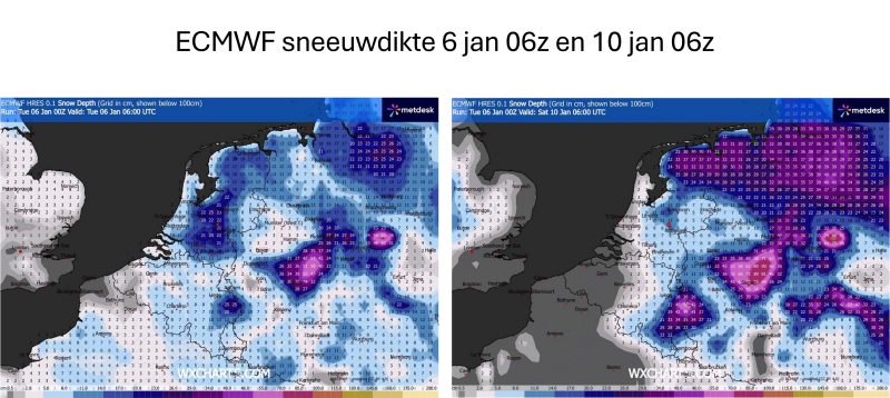 In het ECMWF model zien we het sneeuwscenario duidelijk terug aan de ontwikkeling van het sneeuwdek. Links zien we de “uitgangstoestand” op dinsdag 6 januari met de meeste sneeuw in het midden van het land. In werkelijkheid lag er vandaag, afgaand op publieke data, op enkele plaatsen nóg meer sneeuw… De extreme ECMWF sneeuwdek verwachting die eind december zichtbaar werd, is toch uitgekomen.