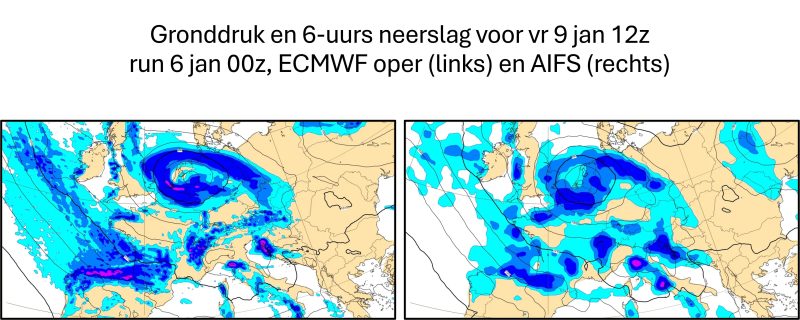 Om te beginnen vergelijken we enkele luchtdruk/neerslagkaarten voor vrijdagmiddag, als het laag ongeveer boven ons land moet zijn aangekomen. Tussen ECMWF-Oper en het ECMWF AIFS model blijkt weinig verschil, al is de neerslagpiek (vooral door een fijnmaziger rekenrooster) in de Oper feller en meer geconcentreerd, vooral aan de zuidkant van de lagedrukkern. Daar kan makkelijk meer dan 25mm/12u vallen. Aan de zuidkant ligt ook het windveld, dat eerder al het zuiden van de UK en Noord Frankrijk heeft getroffen, in Het Kanaal komt donderdagavond een zware storm te staan.