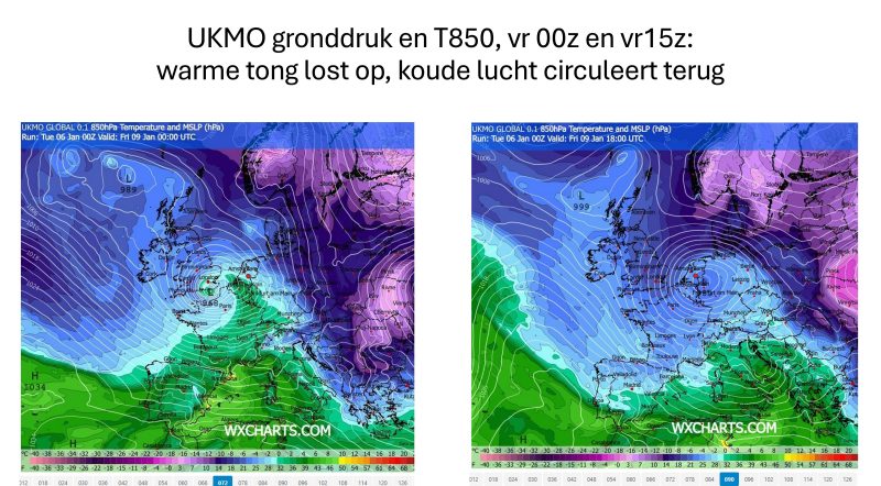 Behalve dat de depressie naar het oosten trekt, vult zij ook op, en wordt de ingedraaide warme lucht geleidelijk weer koud. Enerzijds komt dat door de doorvallende neerslag, anderzijds doordat de cyclonale wind rondom de kern de koude lucht vanuit Noordoost Duitsland en Denemarken weer gaat aanvoeren. Het proces gaat snel, ongeveer met -4 graden per 12u. In de loop van vrijdag wordt regen weer natte sneeuw, en natte sneeuw wordt sneeuw die blijft liggen.
